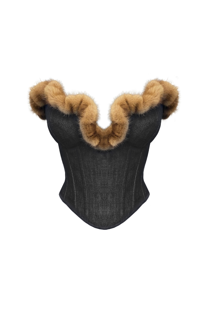 Rosamosario’s signature corset in yellow silk satin and boned structure with zip-up fastening.