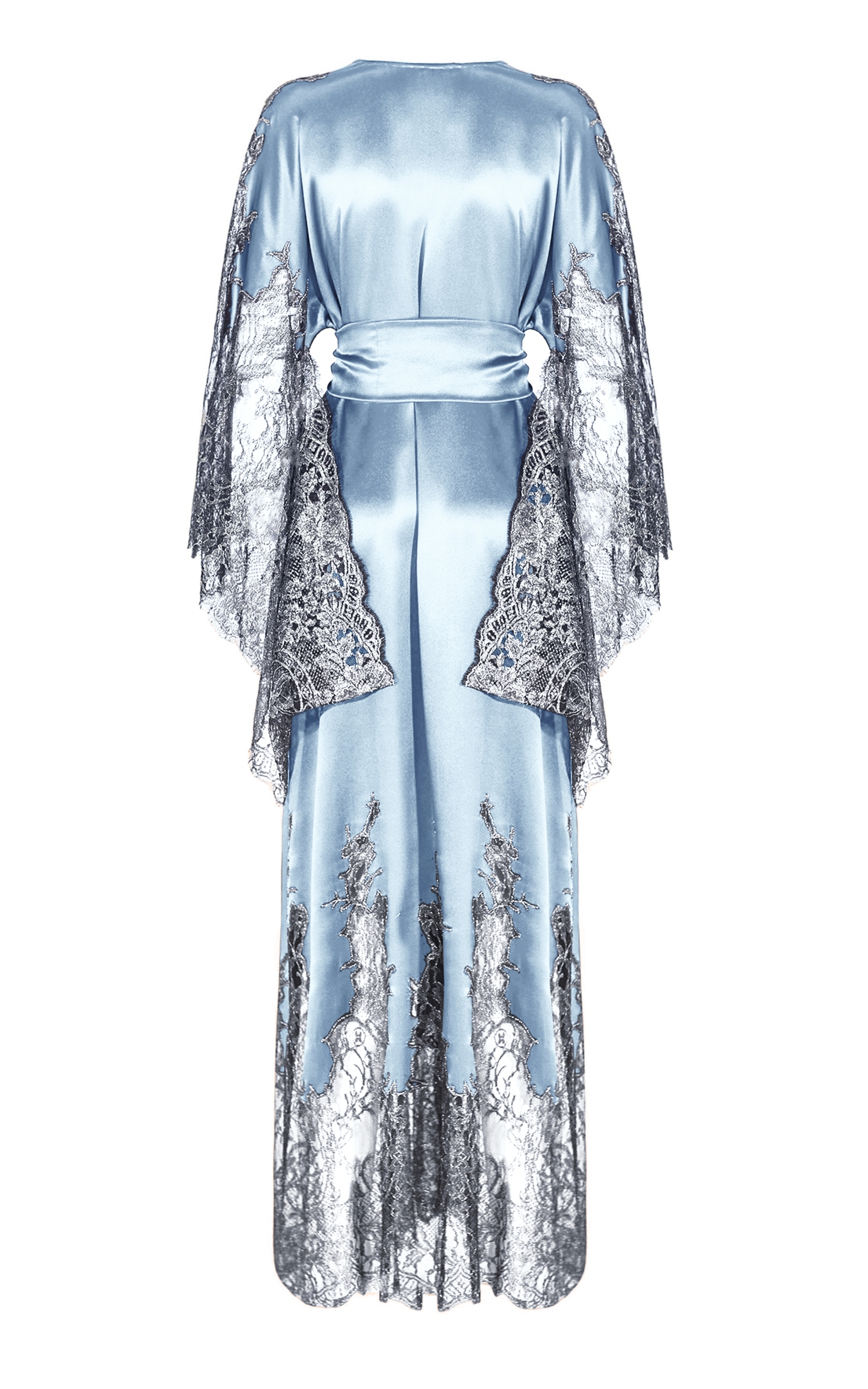 This highly distinguished classic Long Robe flaunts an elegant silhouette for a sensual yet elegant walk. The kimono is made in Italian silk, made sumptuous by the French lace adorning the hems.