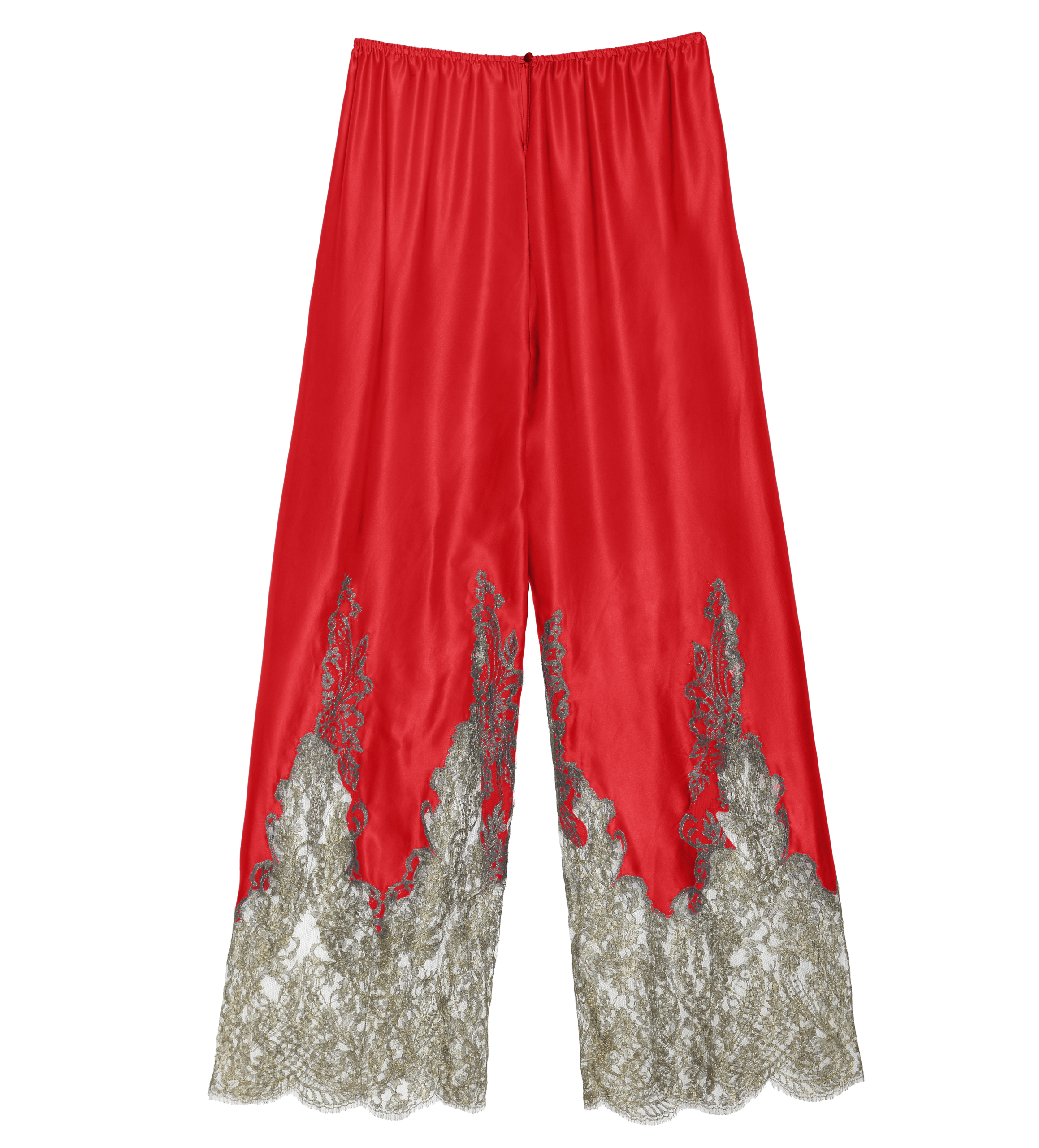 This highly distinguished classic Pajama trousers flaunt an elegant draped cut silhouette for a sensual yet elegant walk. The trousers are made in fine Italian silk, made sumptuous by the French lace adorning the hems.