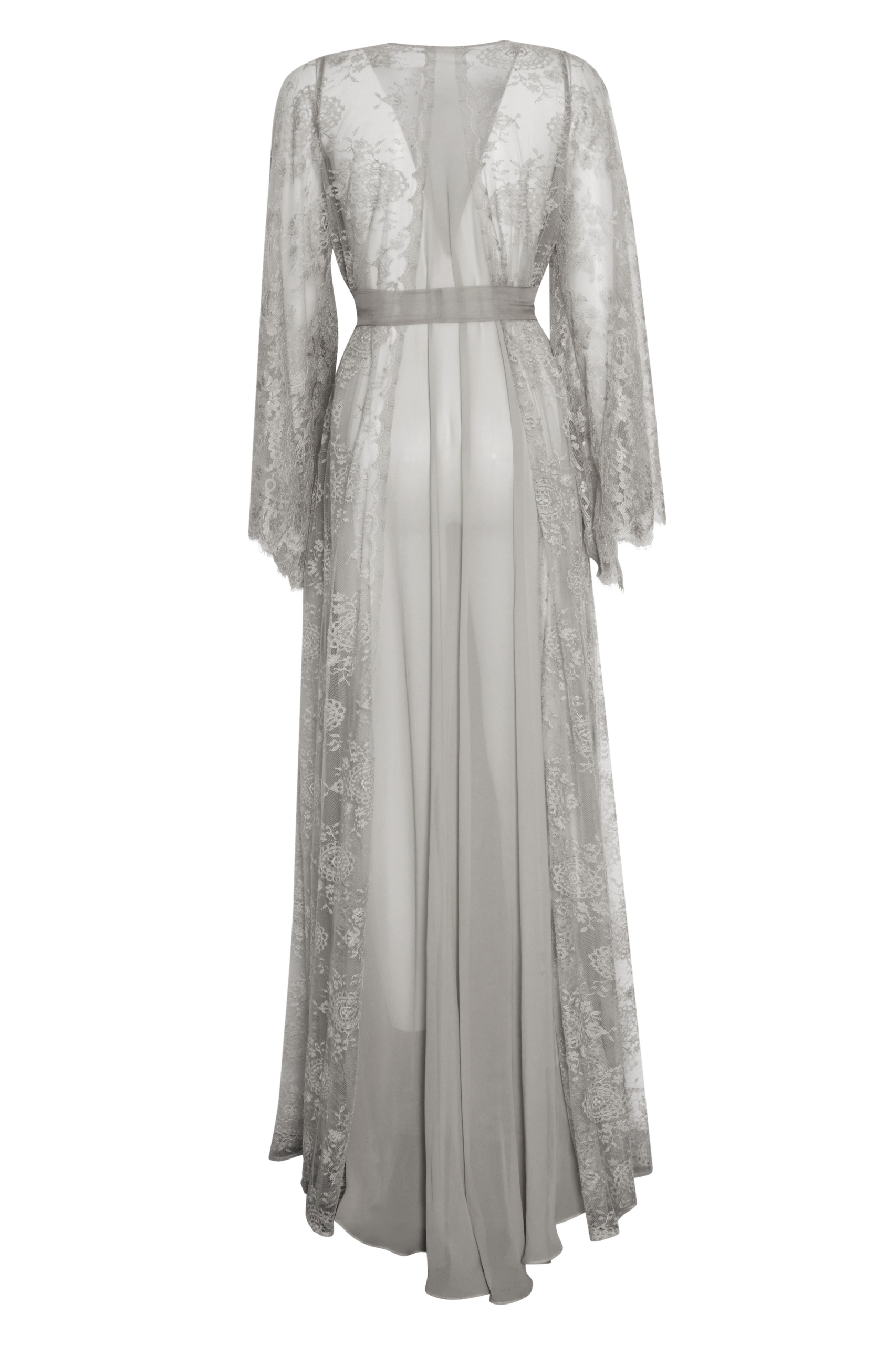 Long robe in chantilly lace and silk chiffon lining with silk belt.