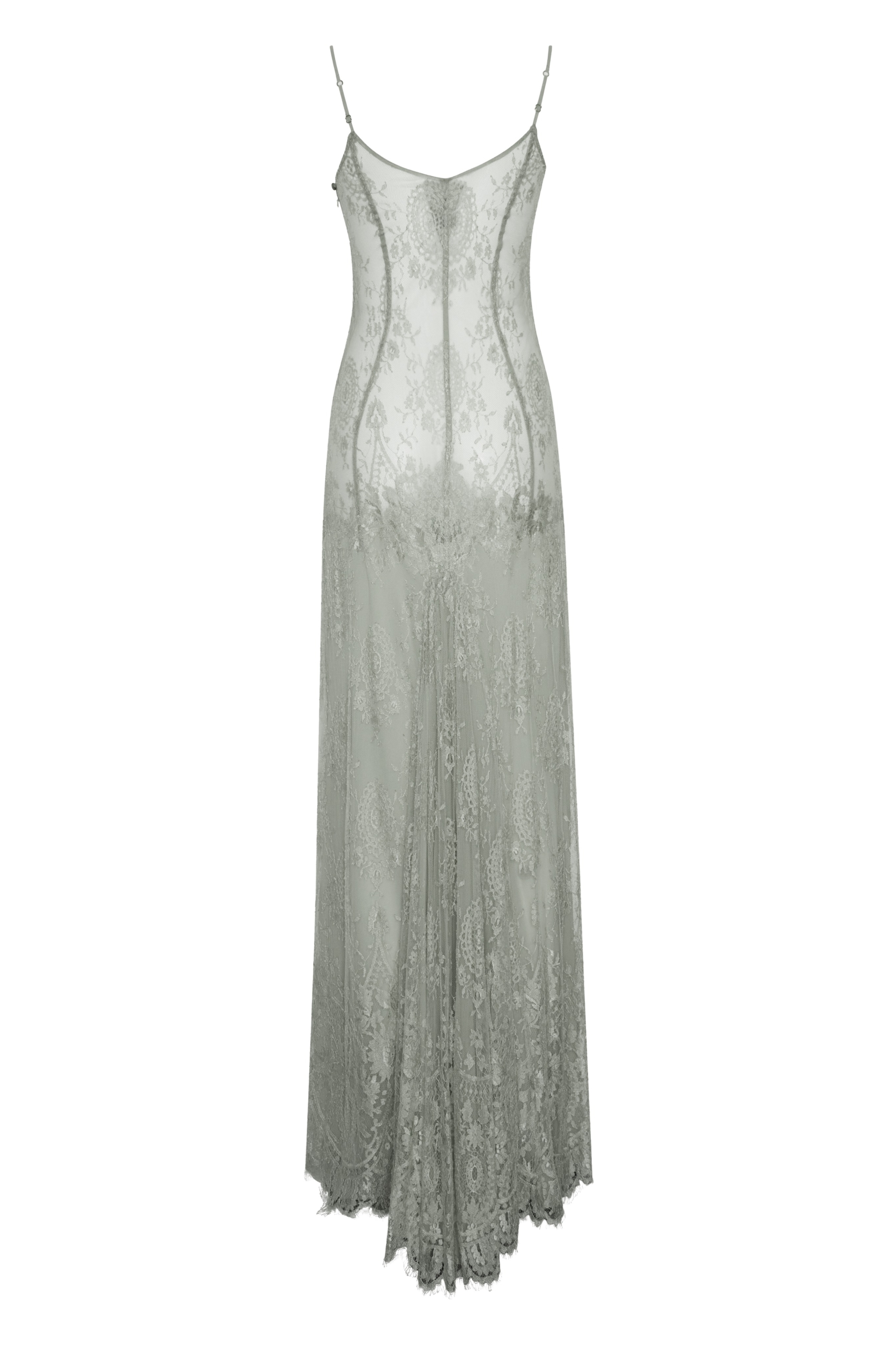 Long dress in chantilly lace and silk chiffon lining with adjustable straps. Back zip and beautiful long tail at the back. The dress is structured as corset cuts.