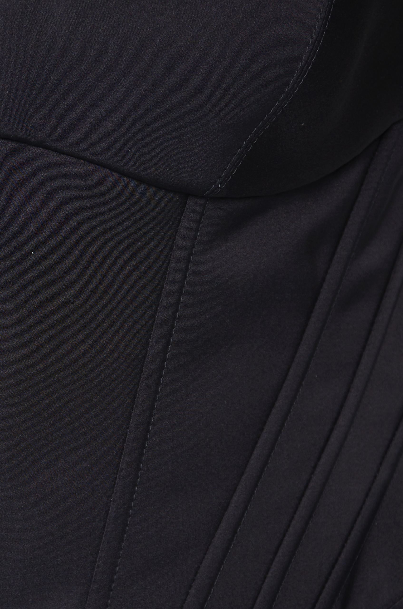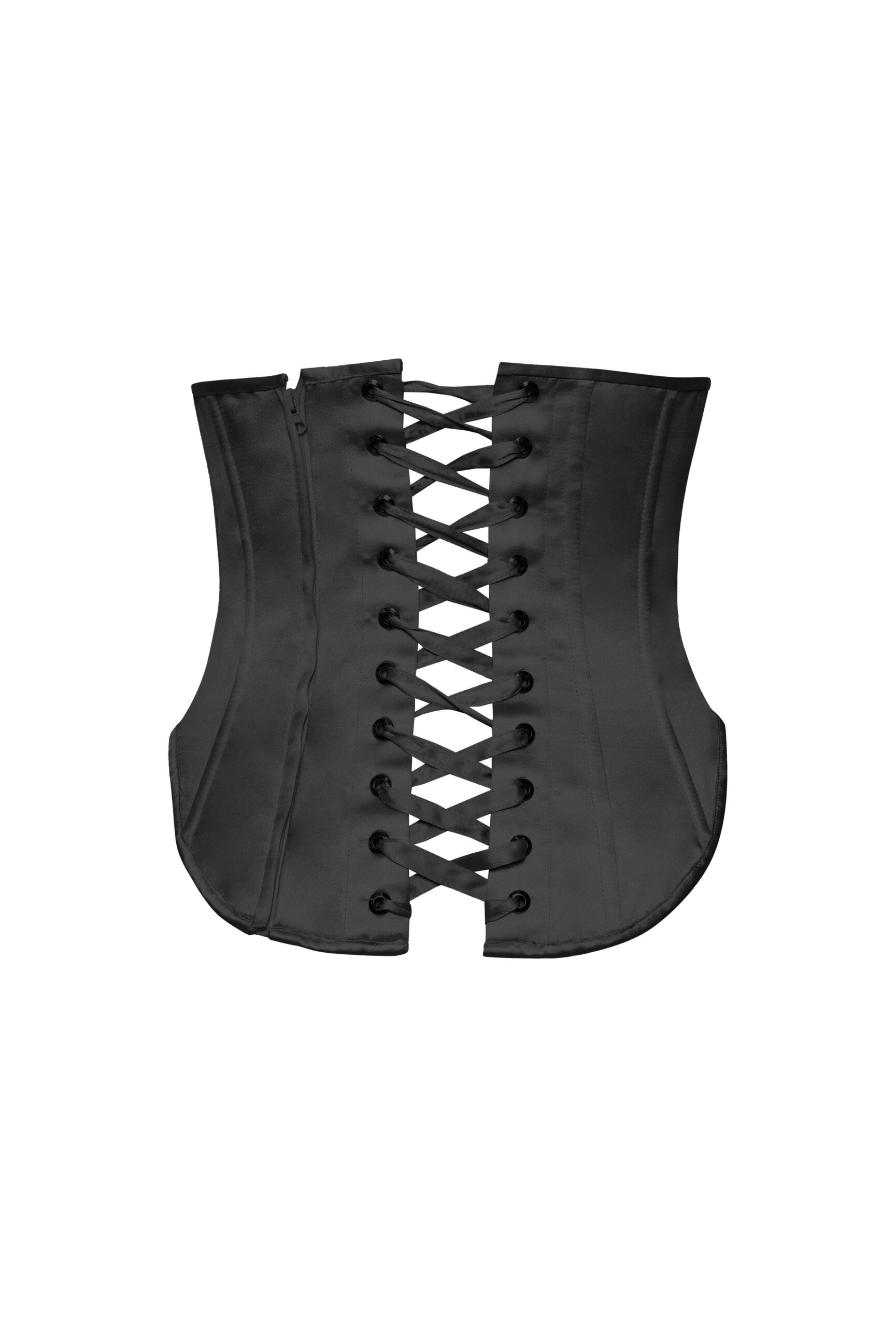 Rosamosario “Sabine” signature corset in black satin and boned structure granting a tailored silhouette and adjustable back for a perfect fit.