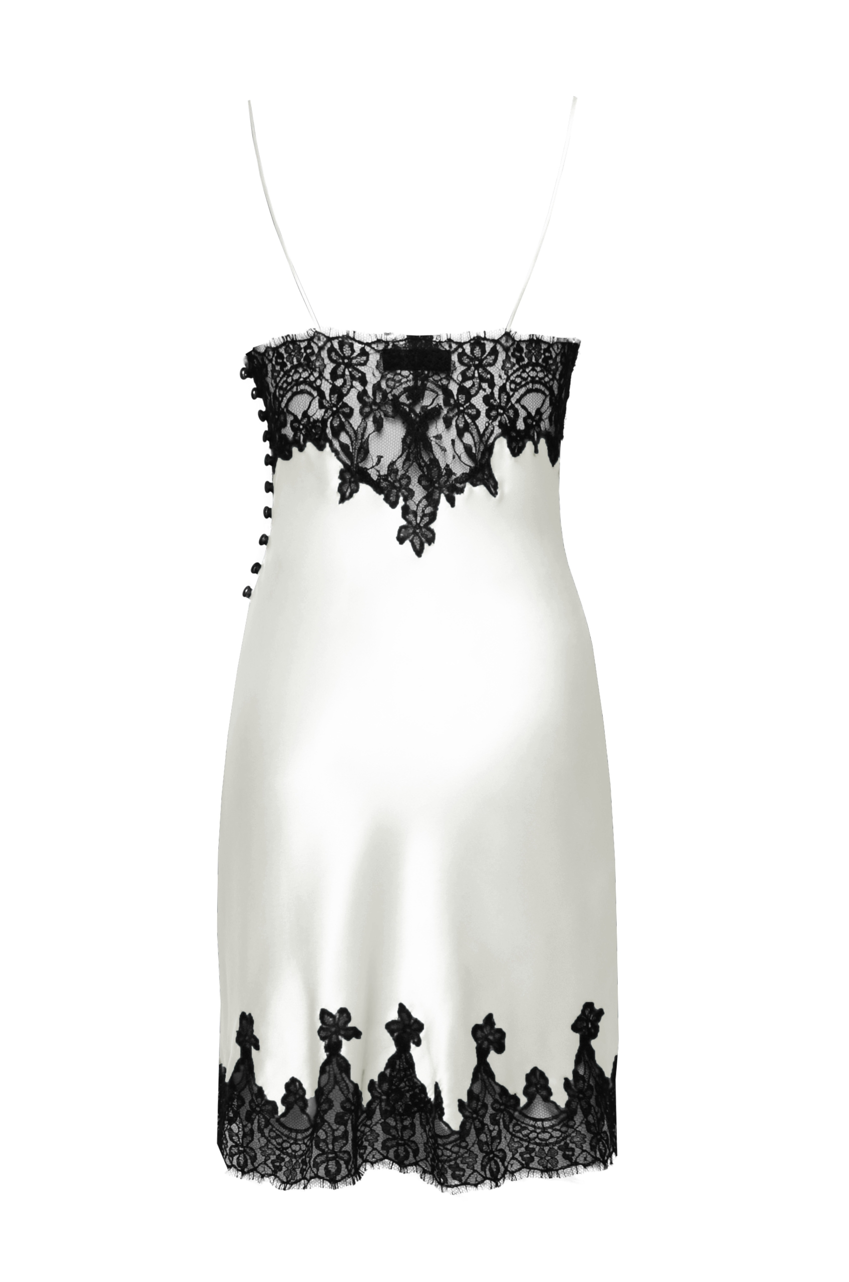 Rosamosario’s pure silk satin short dress with French Chantilly lace decorations.