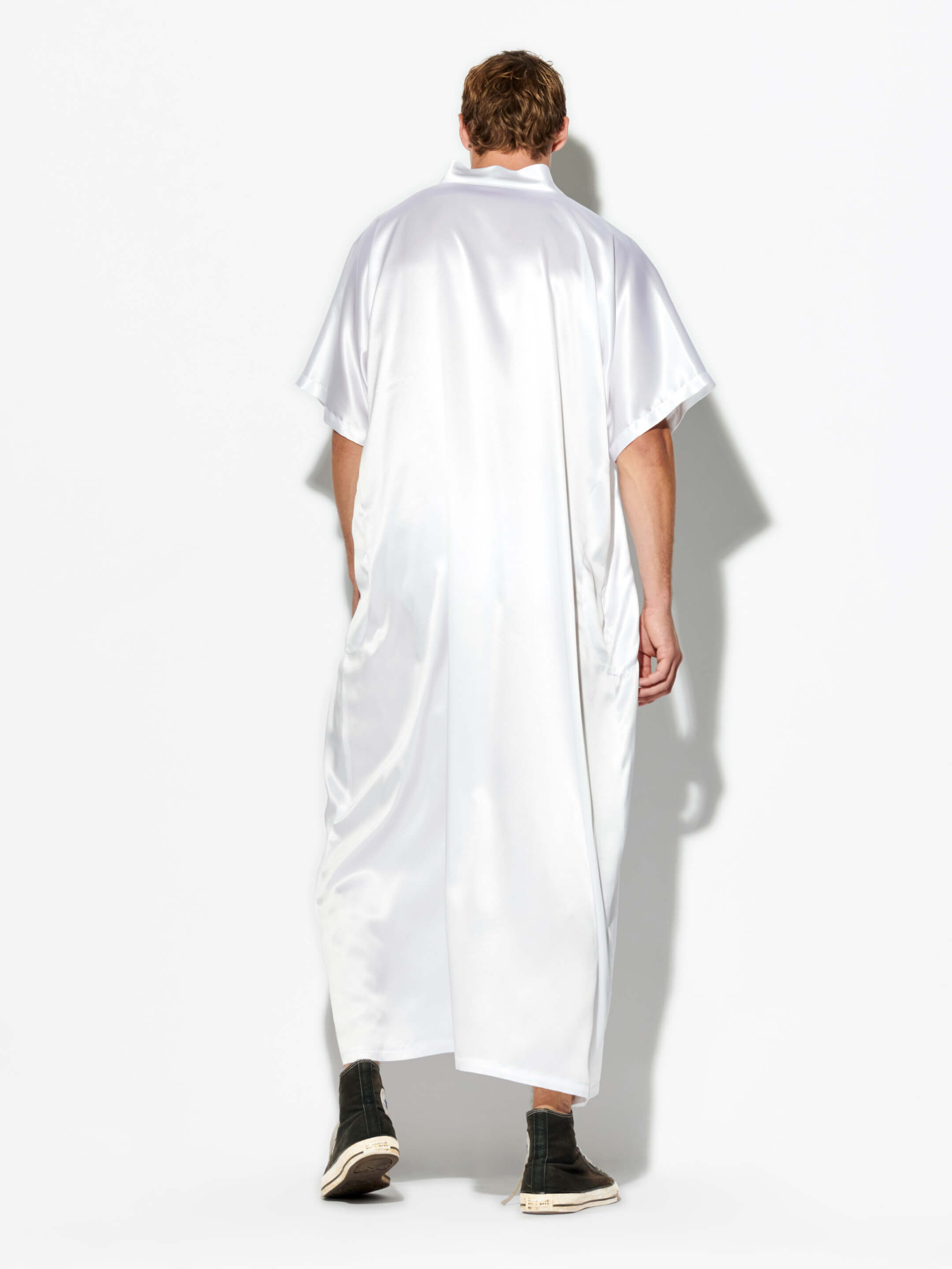 The idyllic and celestial man. Sophisticated texture and delicate silk details decorate the “Caelus, Dio dei Cieli” kaftan from Mosario. Classic and luxurious elements continue to permeate the aesthetic, blending perfectly with the contemporary for an updated, sensual and attractive style. It feature a silK kaftan with shorts sleeves and front pocket.