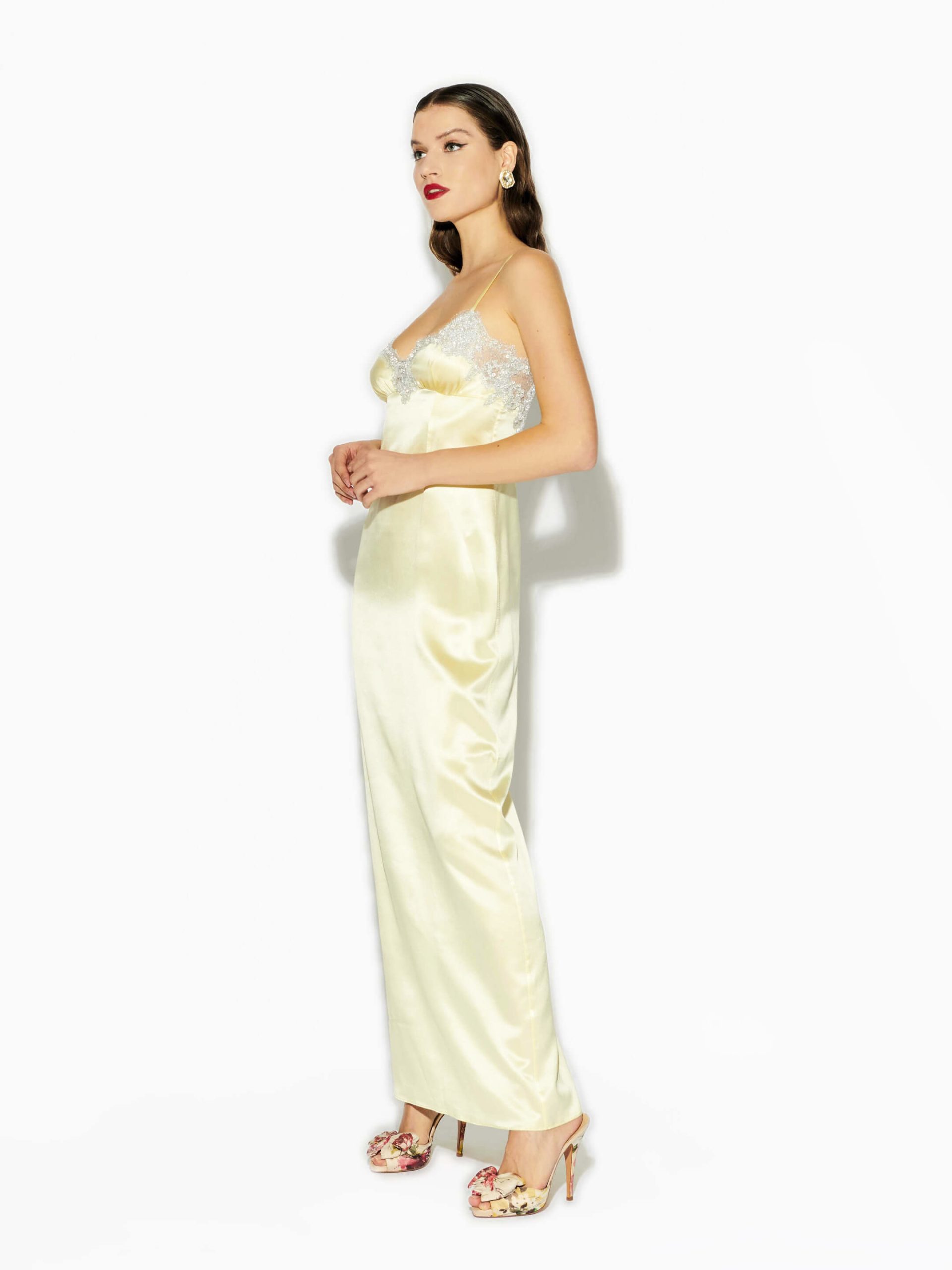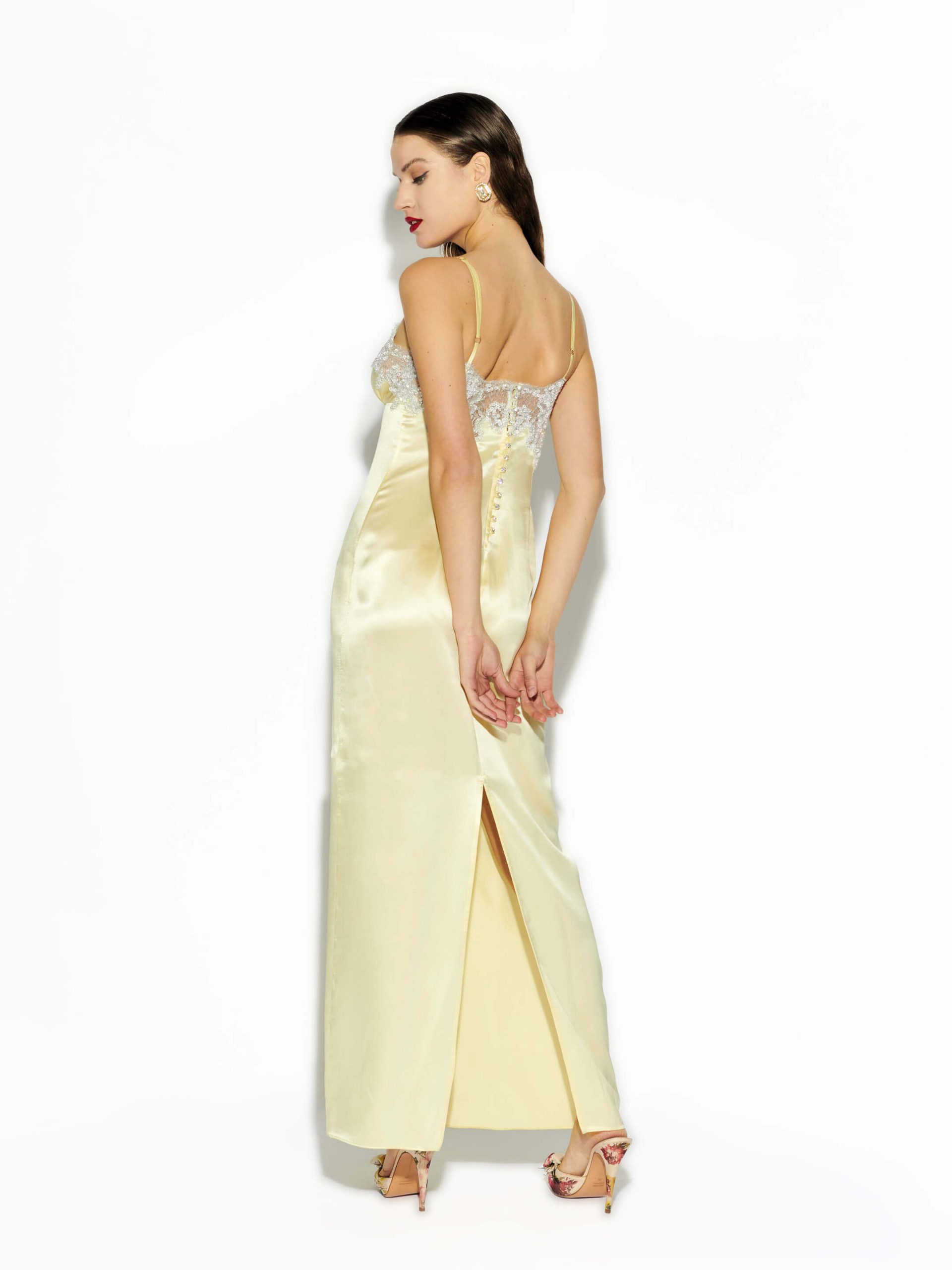 Rosamosario “Echelle” luxurious silk satin night dress with silver Chantilly lace borders at v-neckline. Decorative Swarowski side button up closure, adjustable straps for support. This nightdress is a real eye catching piece with a romantic touch. The babydoll style fit , beautifully enhances the waist creating a feminine silhouette. Rosamosario Cosmic Love night dress will leave you looking like a greek goddess..