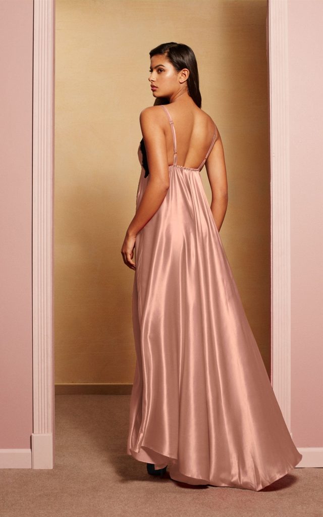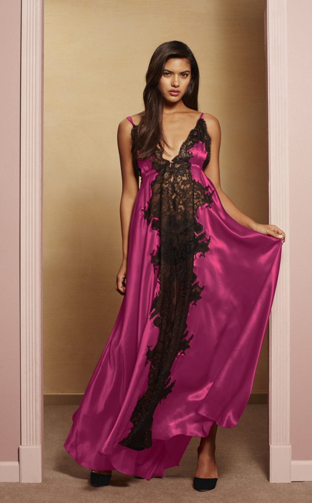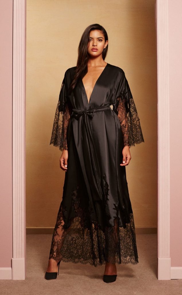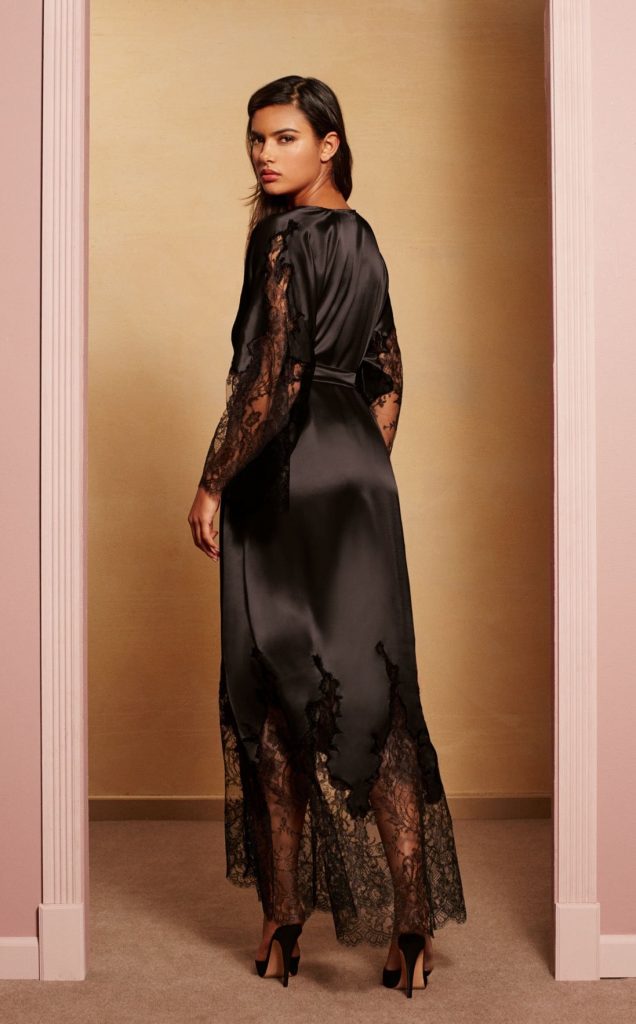 This above-the-ankle bolero with short sleeves and sumptuously decorated clivage makes for a deeply sedactive vintage appearance. The silk georgette is coated all around by precious French chantilly lace, and the bottom hem is sensually crispy, highlighting the natural cruves of the body.