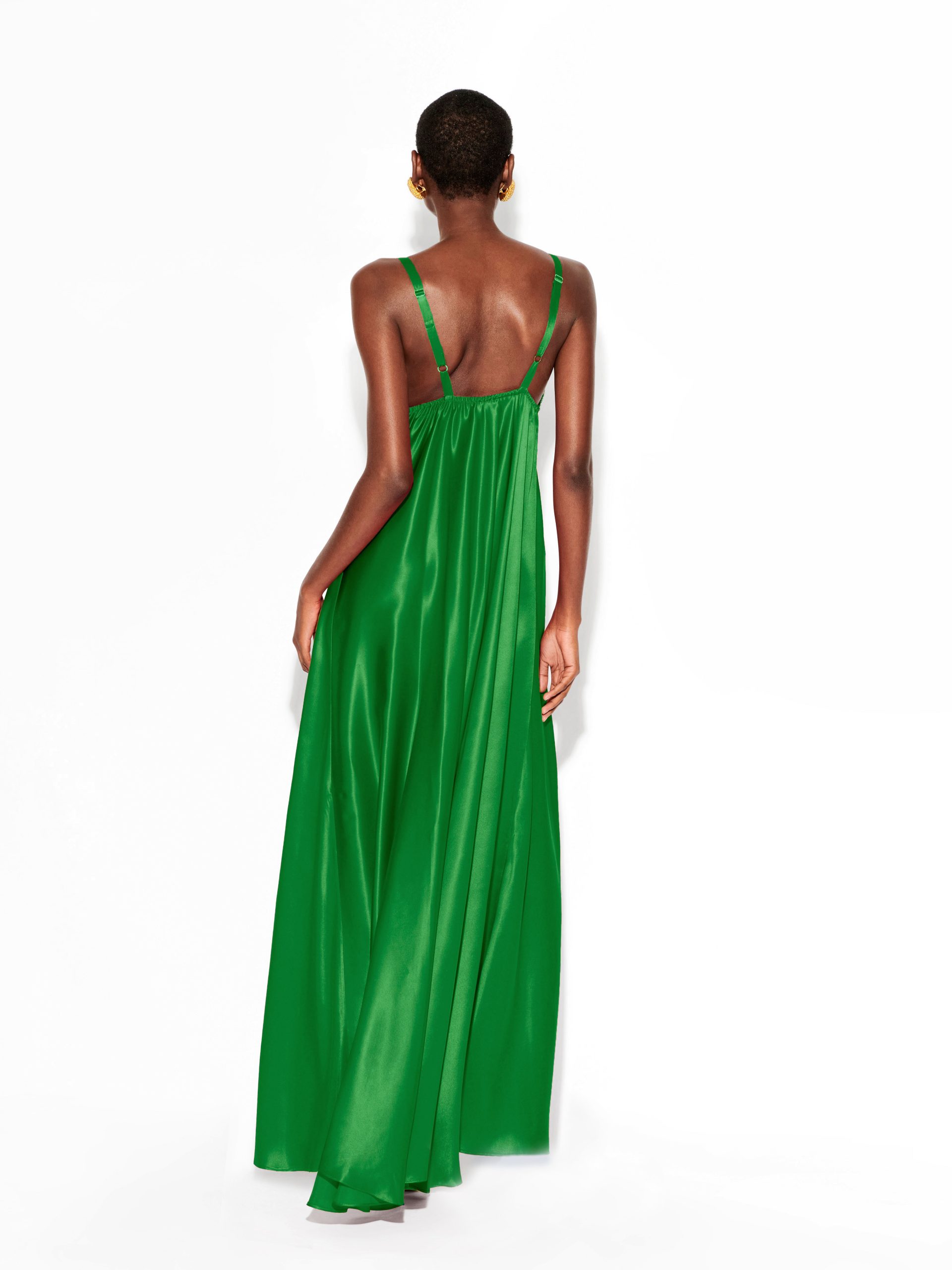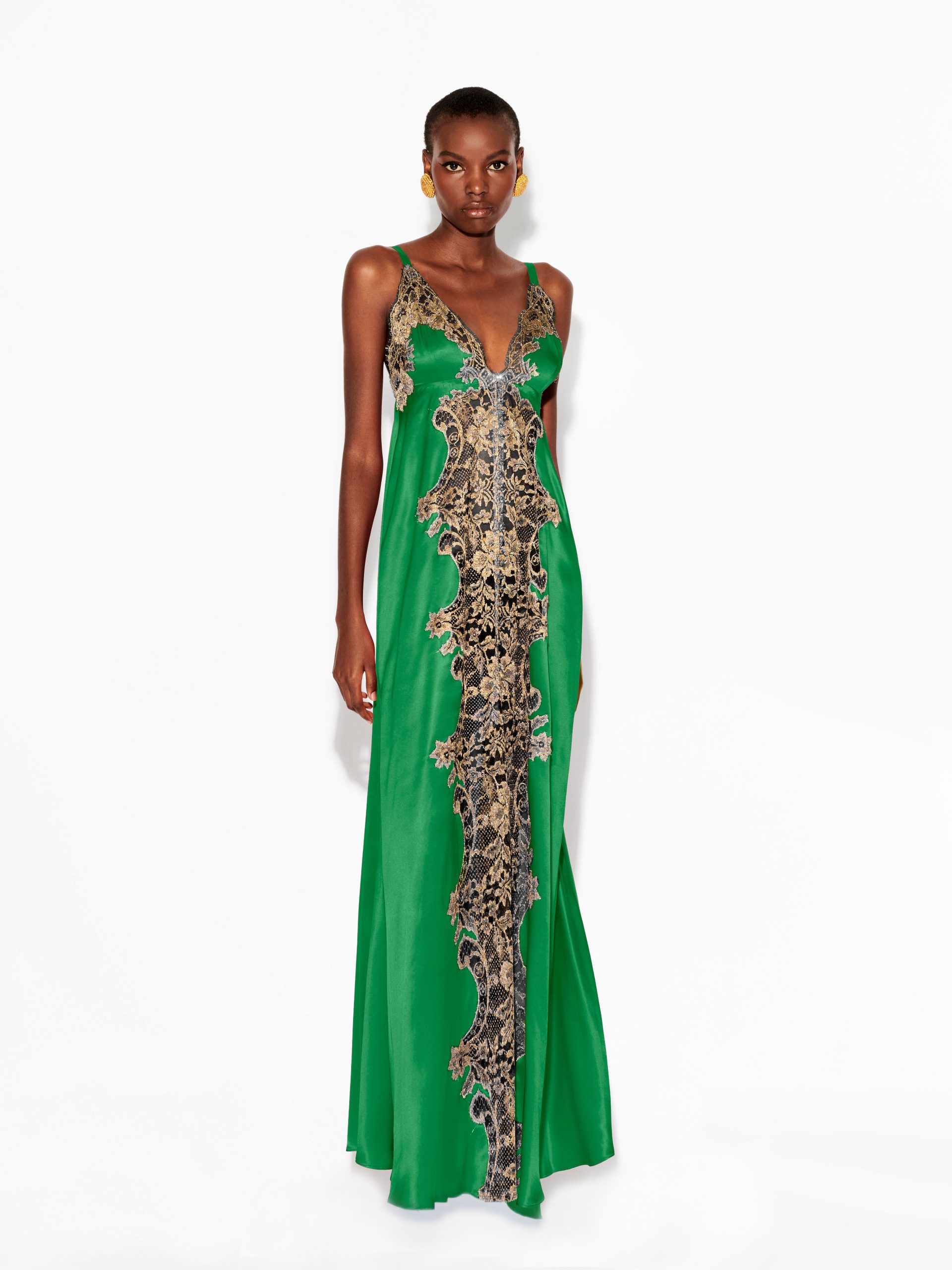 Rosamosario’s signature “Mardea” is tailored in a stunning hued silk satin. Gold lace detailing creates a glamorous touch while the effortless shape is suitable for day to evening wear.