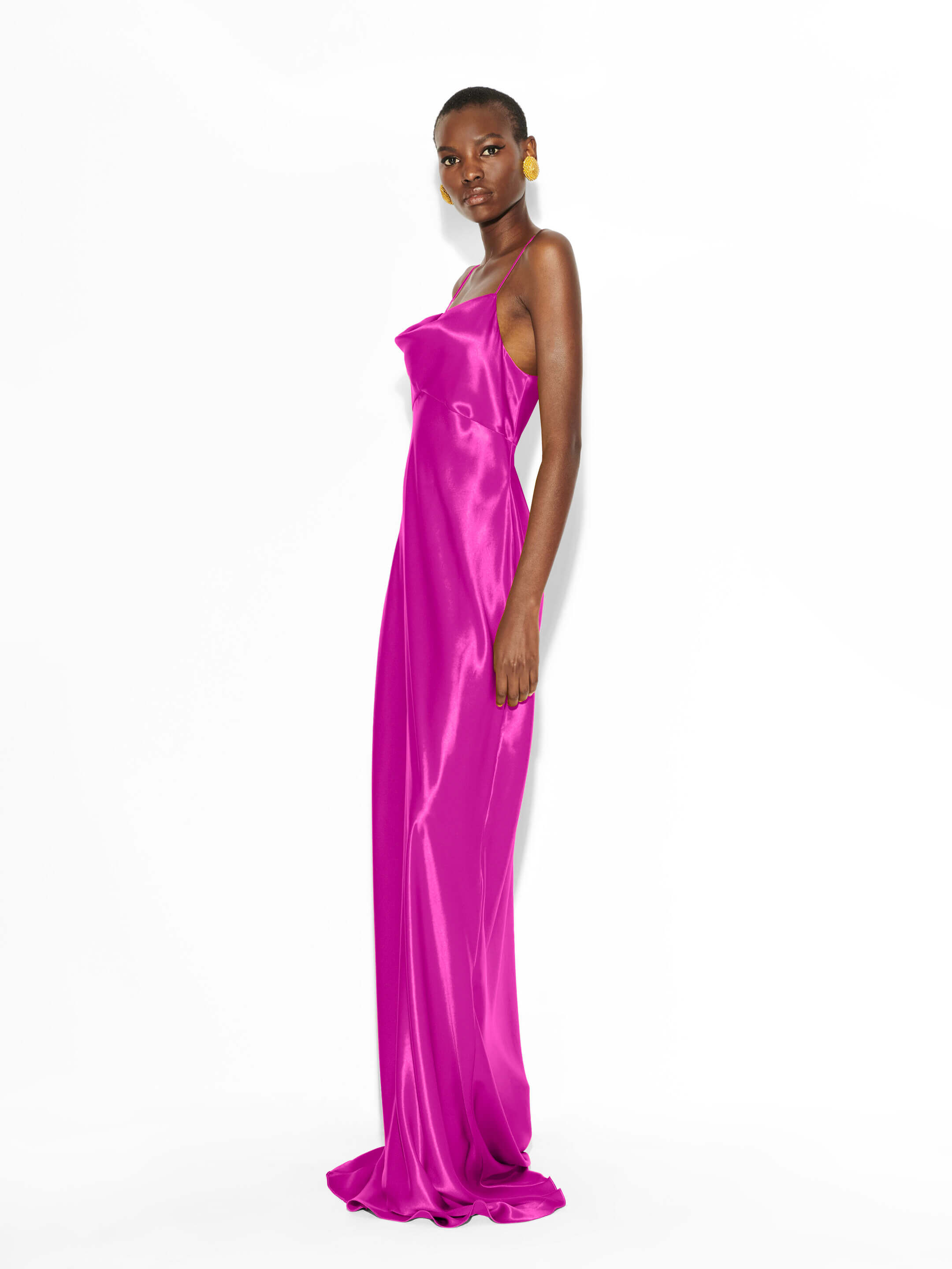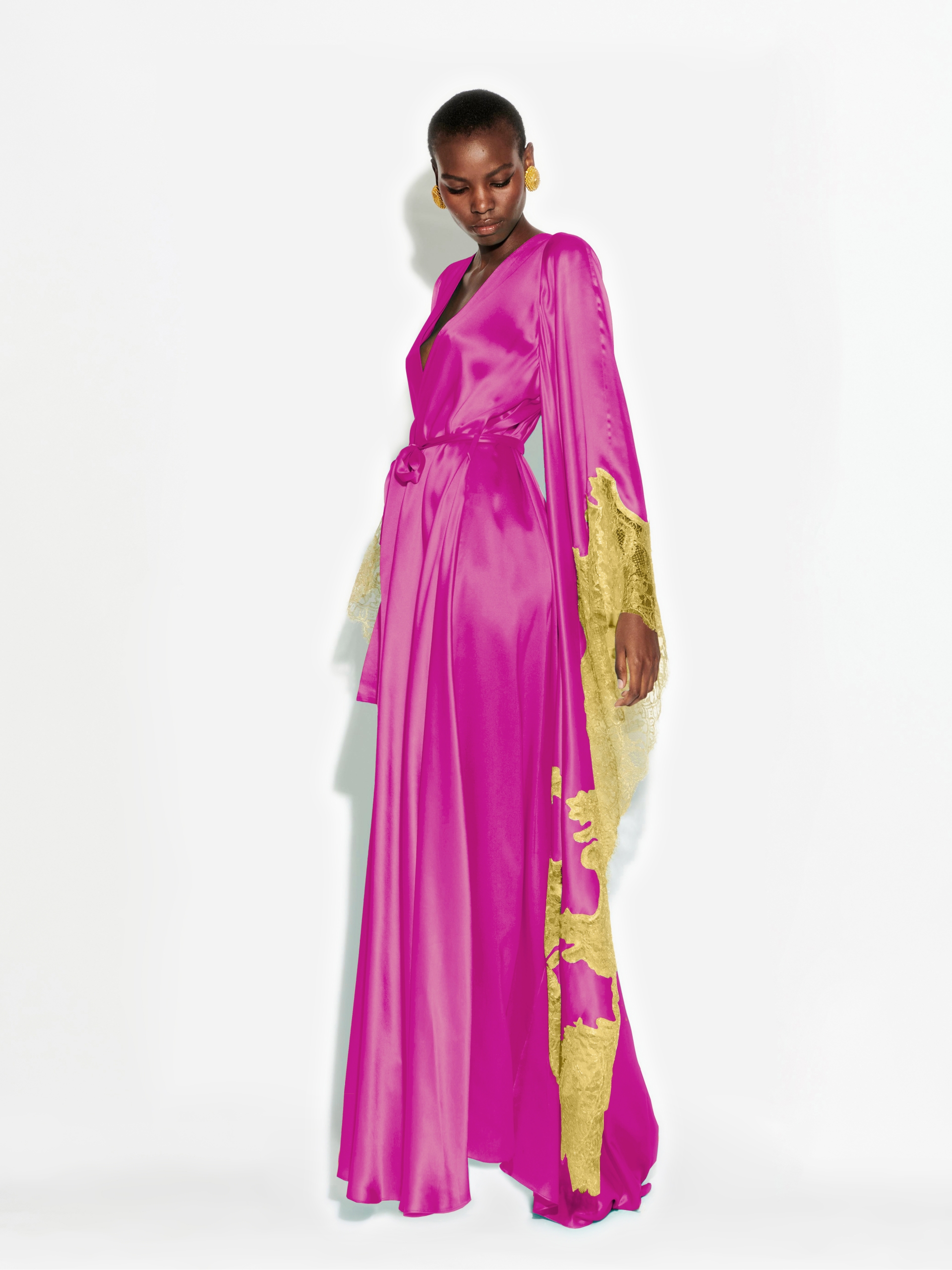 Strike a pose! In the “IME” long robe, which adorns the body softly yet powerfully. The silk satin combined with golden Chantilly lace create a fresh, undeniably beautiful look.