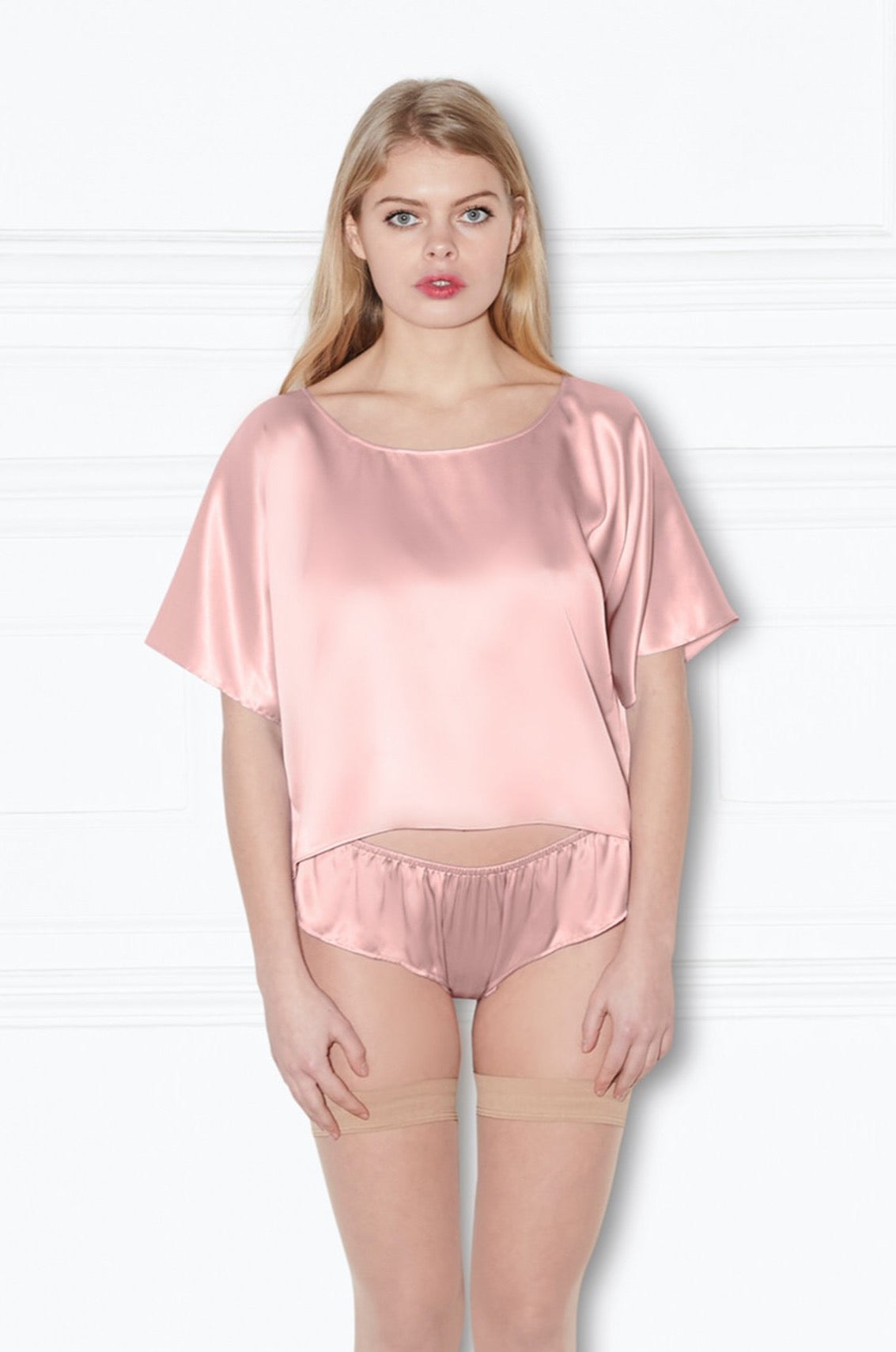 Rosamosario “Villa de Rothschild” signature pajamas set is tailored in splendid old pink hued silk satin. The panties have an effortless ruched fit, enhancing beautifully your derriere.