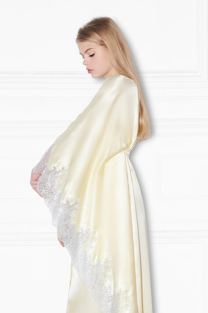 Strike a pose! In the “Madame Bardot” long robe, which adorns the body softly yet powerfully. The lemony silk georgette combined with silver lace creates a fresh, undeniably beautiful look. Additionally, there is a discreet silk tie, that lays upon the waistline, for full versatility. A stunning Rosamosario signature piece.
