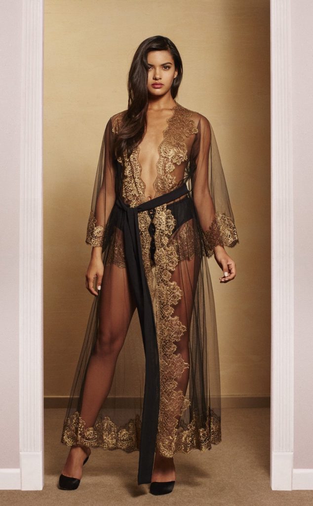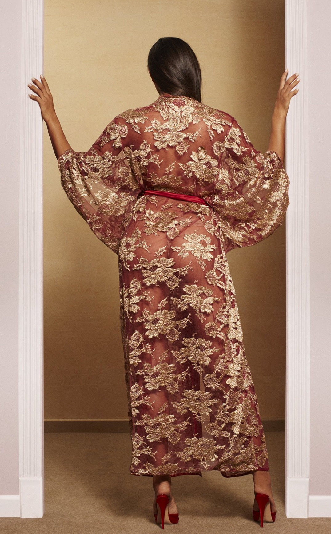 Long evening kimono with opulent bat sleeves cut and overlapping panel for an exquisitely couture shape. The overlayering of burgundy tulle with rich lace in metallic gold makes for a strikingly royal contrast. Of floor length and comfortable fit, this distuinguished style is given a touch of femininity by a precious silk satin belt that shapes the waist.