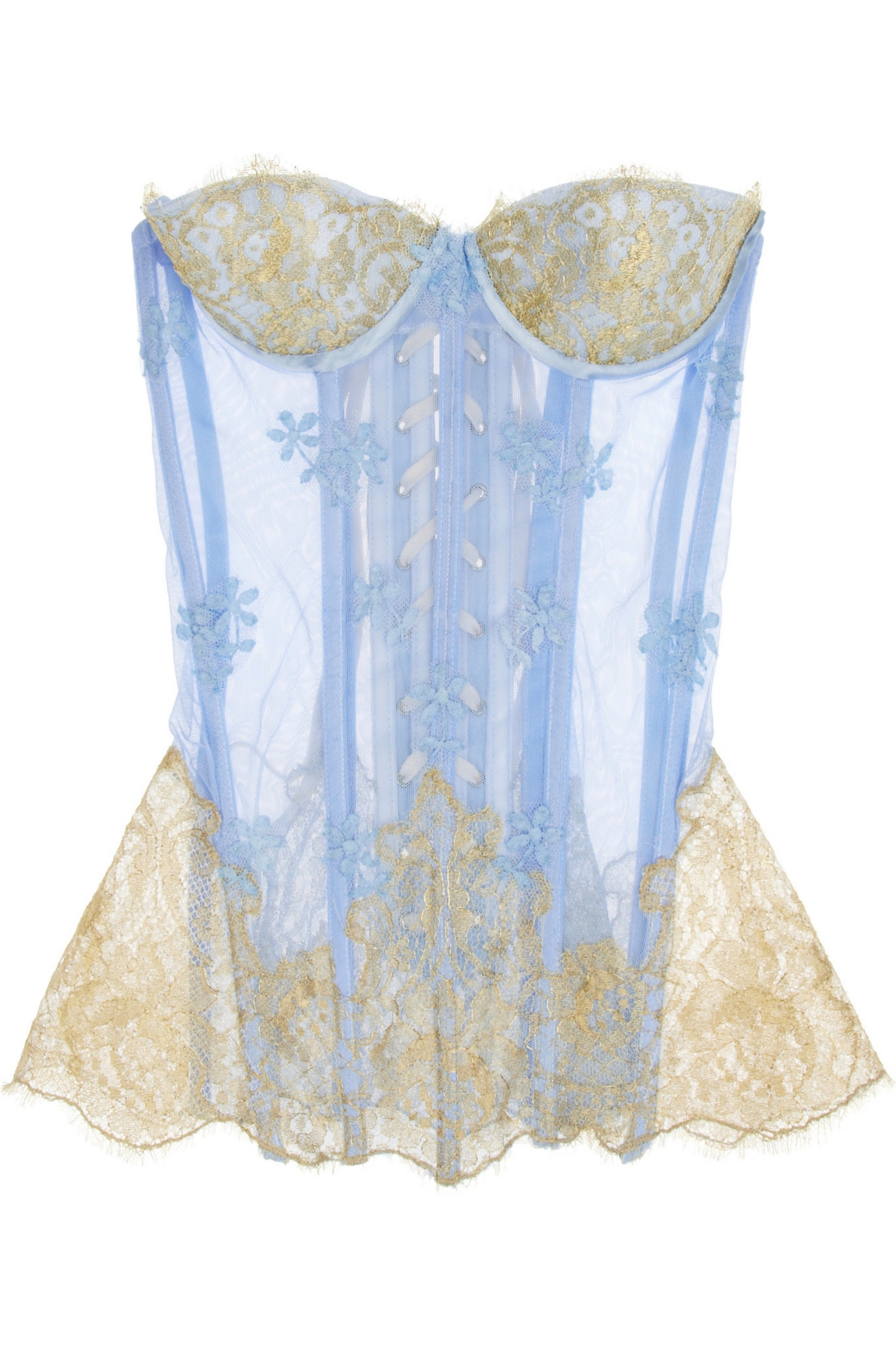 Rosamosario romantic and opulent strapless bustier that blends delicate craftsmanship with vintage-inspired glamour. The sheer powder blue mesh body is reinforced with vertical boning channels for structured support, while intricate floral appliqués adorn the front panel for a feminine, ethereal touch.
