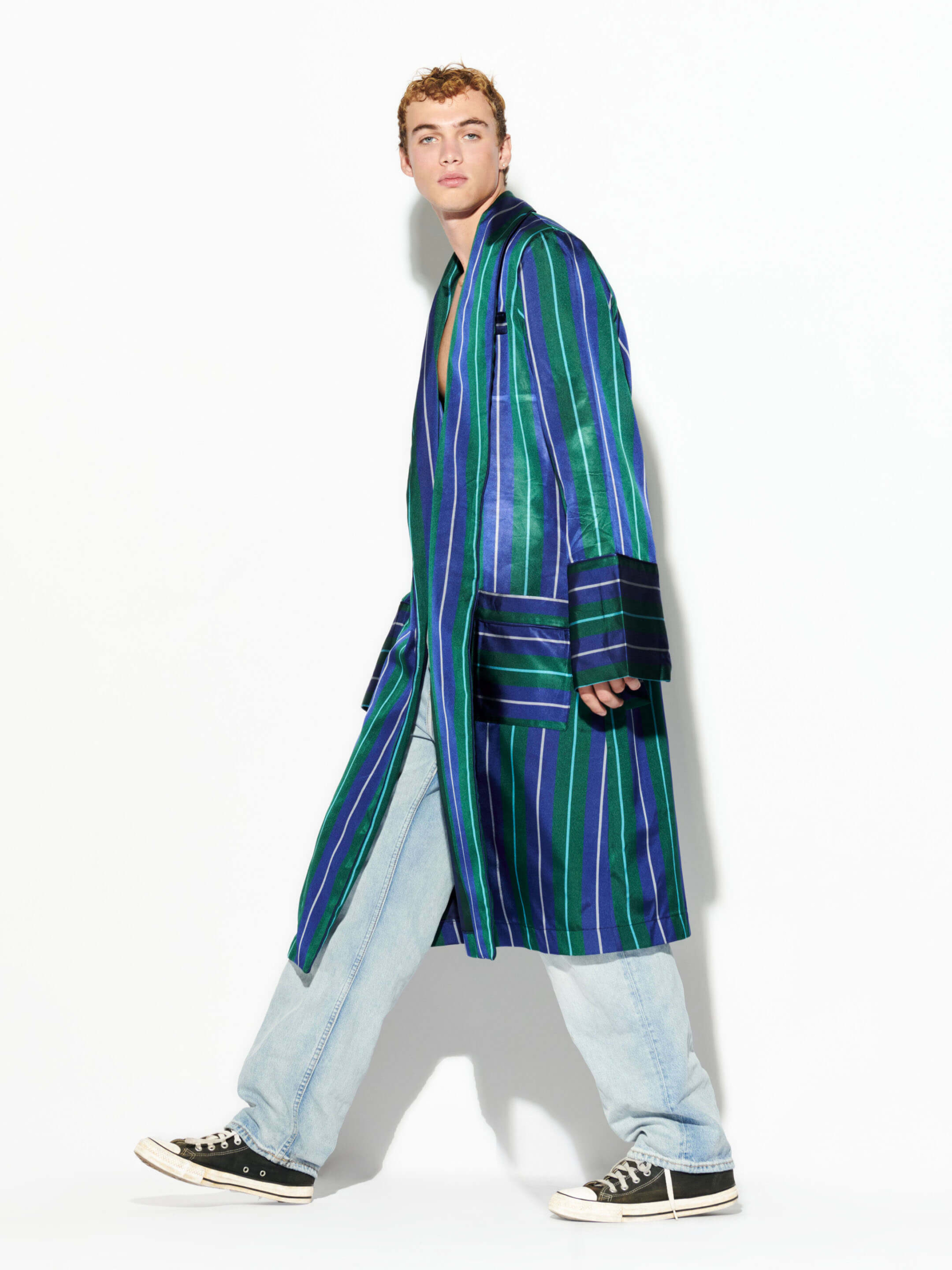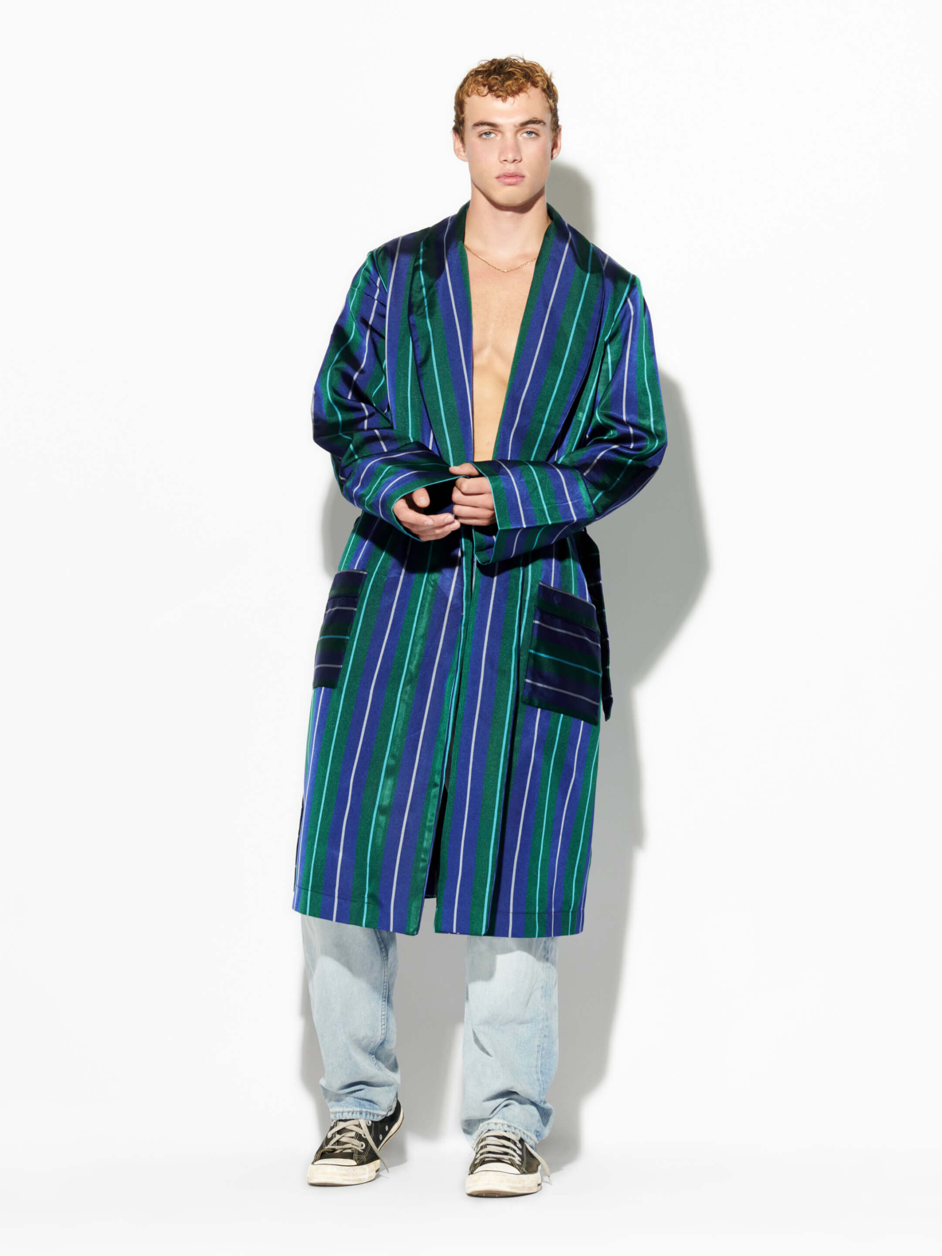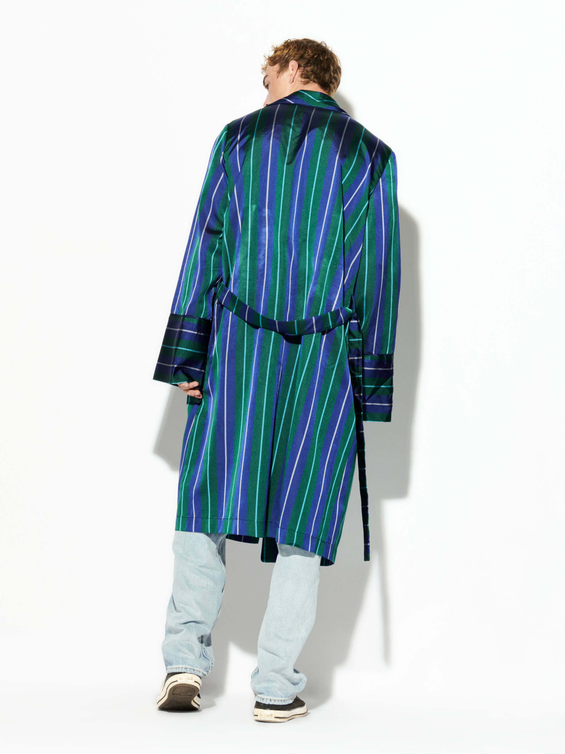 Cut from a luxurious blend of pure silk in a striking blue, green and white stripe pattern, this Mosario “Monsieur Brummell” robe features soft fabric that melts over your shoulders and a wrap belt that allows it to be worn casually loose or cinched at the waist. Fully lined and finished with side pockets.