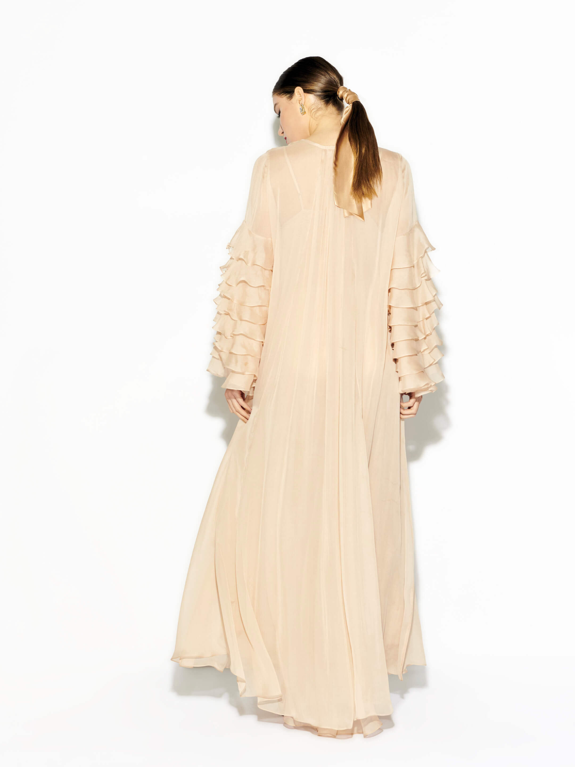 The golden hour is touched by magic, a magic that exists in the ‘Adoree’ robe. The sun is an extravert and as extravagant as nature intended; challenge that frivolity with this incredible Rosamosario robe. Crafted from Italy’s finest silk satin organza and masterfully fashioned into a true piece of art. The ostentatious ruffle sleeves are a glorious statement and they sit perfectly on the cascading gold organza falling gracefully upon create luxurious robe fit and feel.