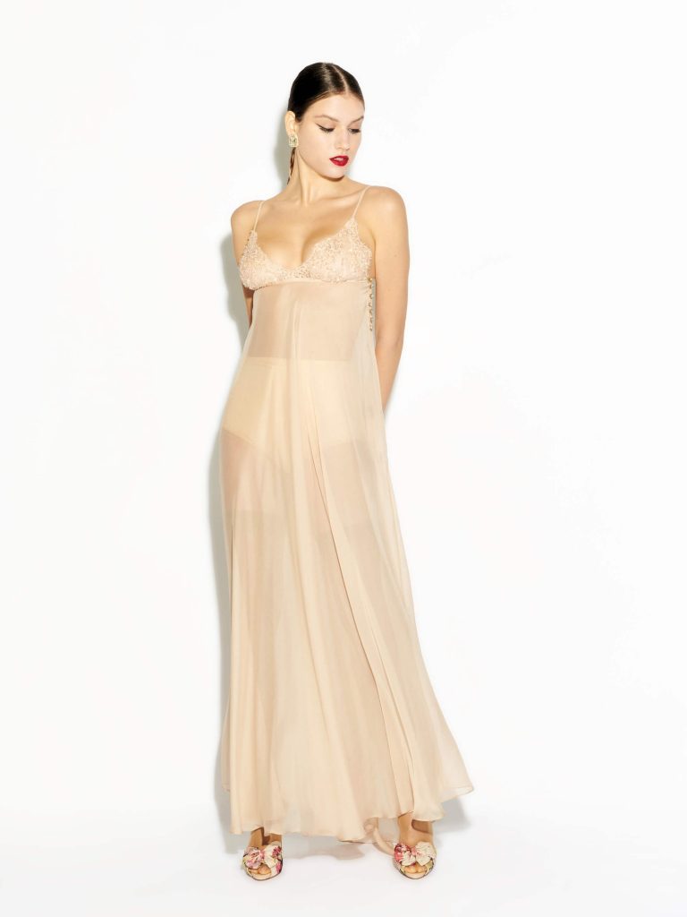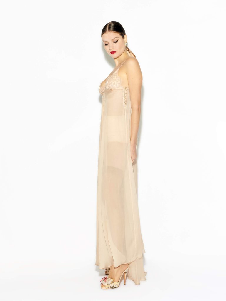 Hipnotysing kimono in invisible tullle. The loose fit cut around arms and legs is sealed by a precious silk satin belt. All around the front and sleeves the seethrough robe is enriched by a delicate chantilly lace in viscose for a mysterious yet classy pose.
