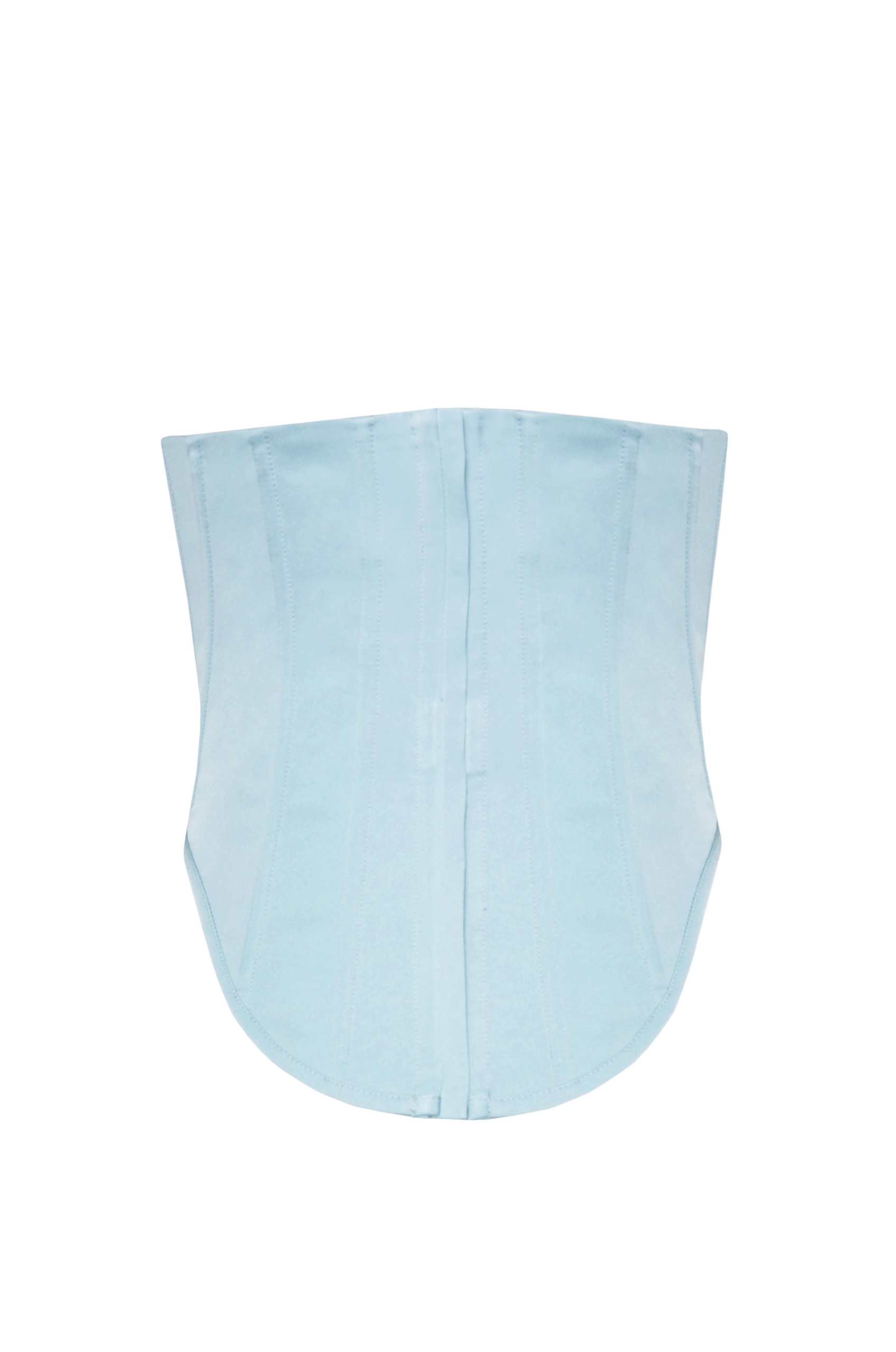 Rosamosario’s signature corset in light blue taffetà and boned structure with zip-up fastening.