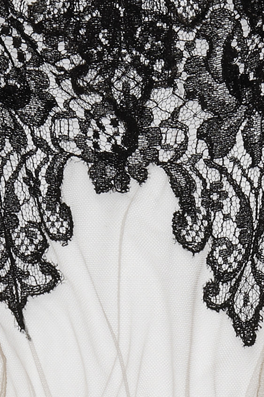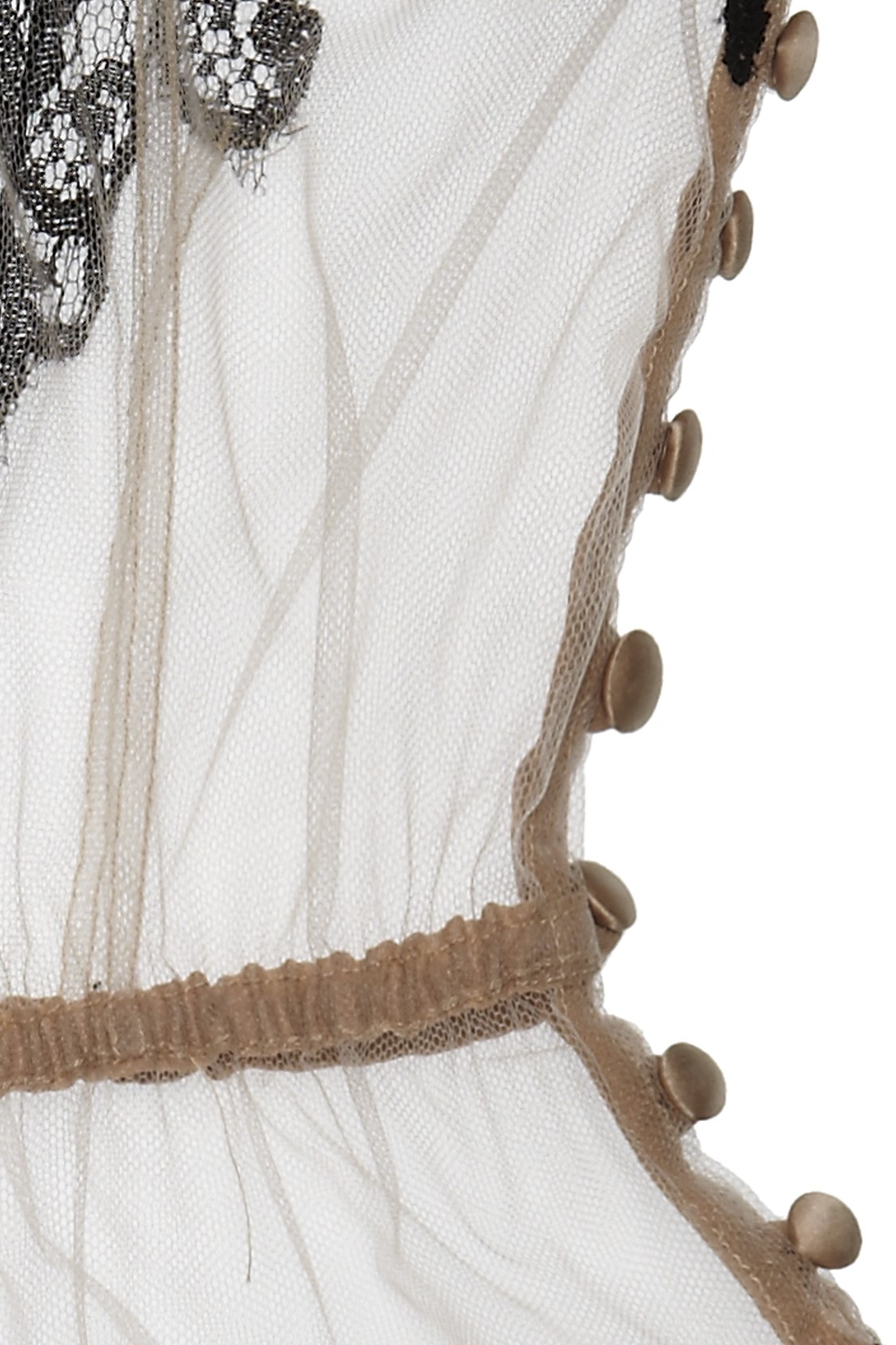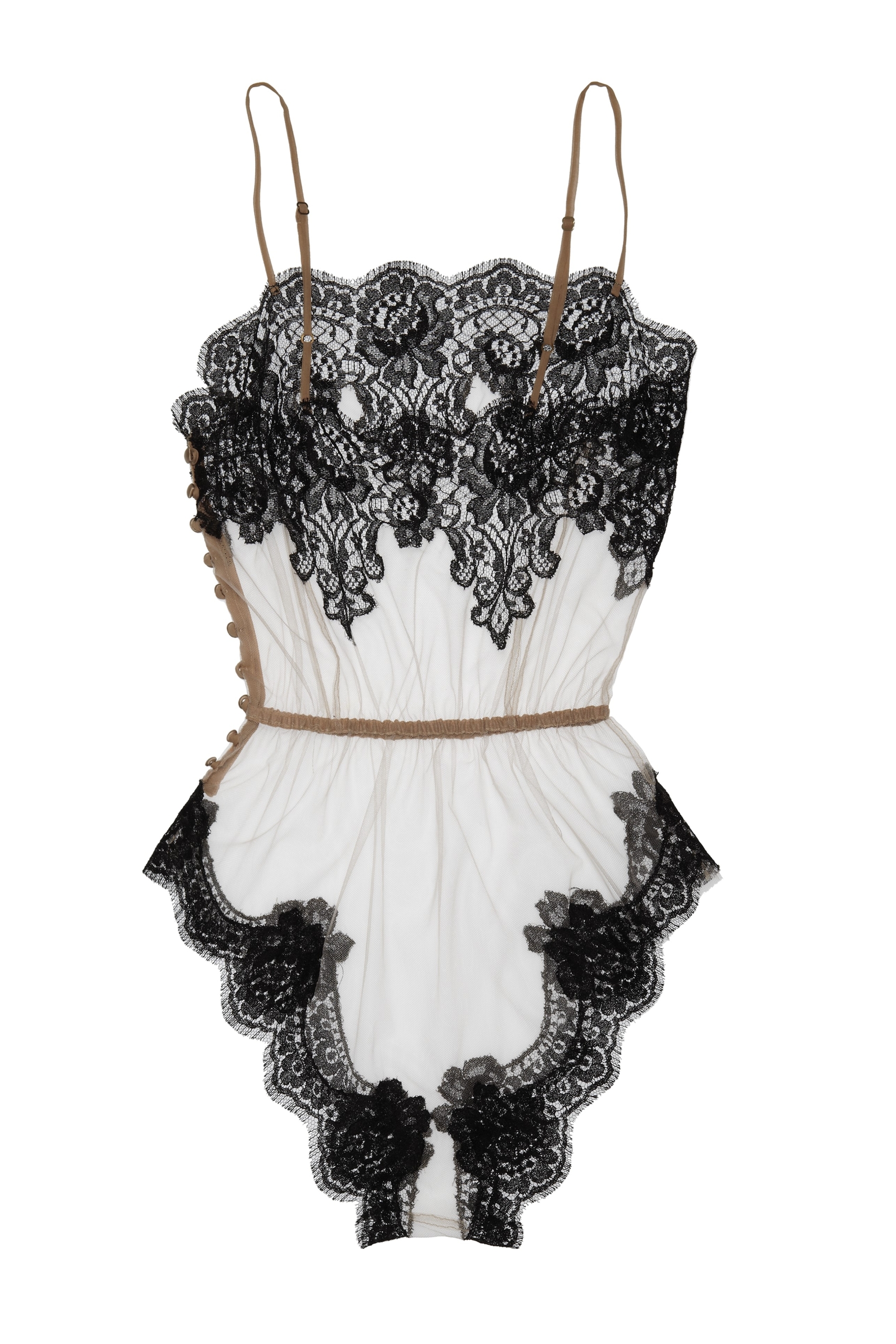 Nude sheer illusion tulle lingerie teddy bodysuit with dramatic black Chantilly lace appliqué trim along the bustier neckline and scalloped hem, nude/beige spaghetti straps and elasticated waist band with small button detailing along the sides, open-front peplum skirt silhouette at the hips, intricate floral lace motifs, high-cut leg opening with scalloped black lace border.
