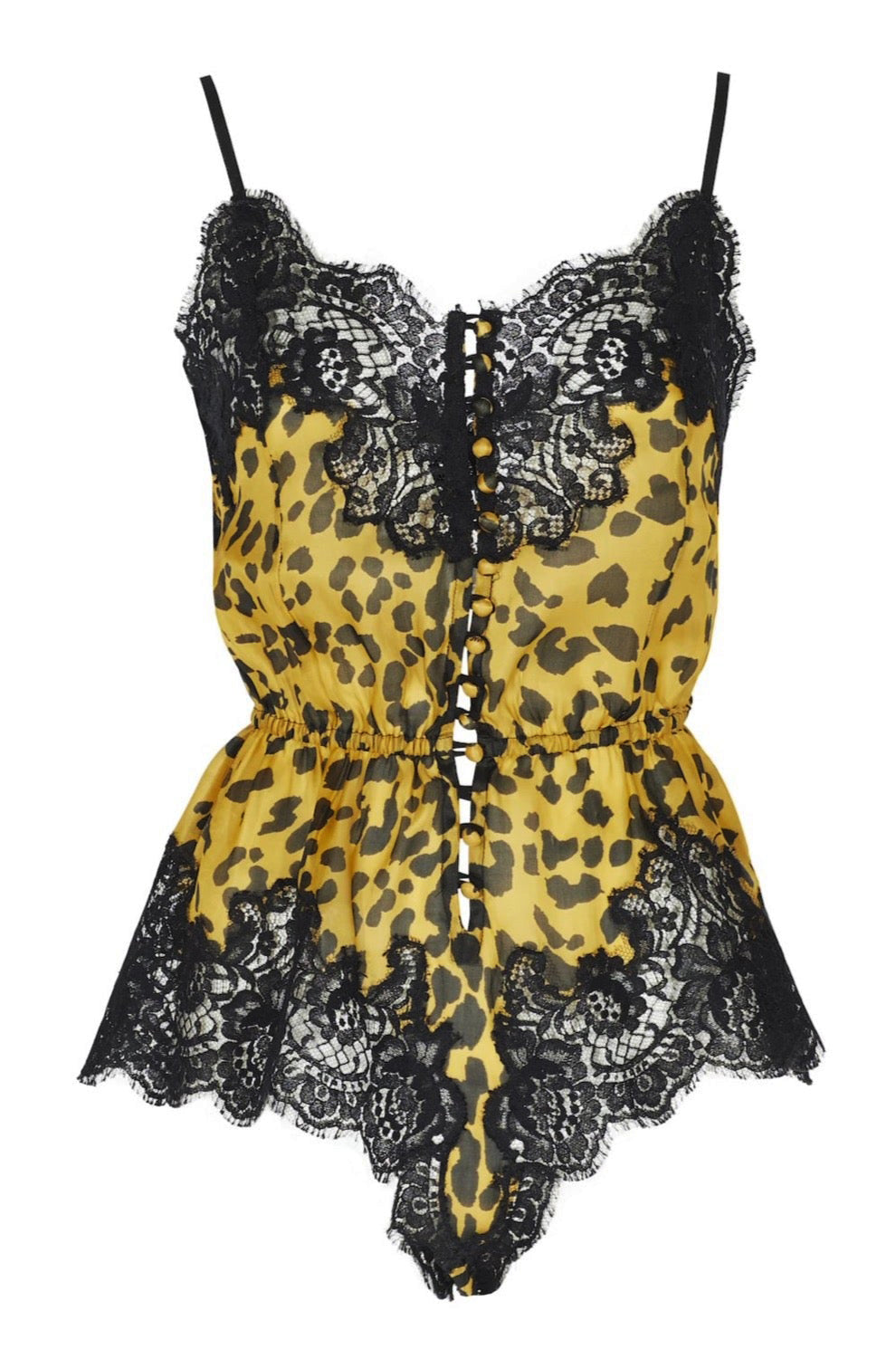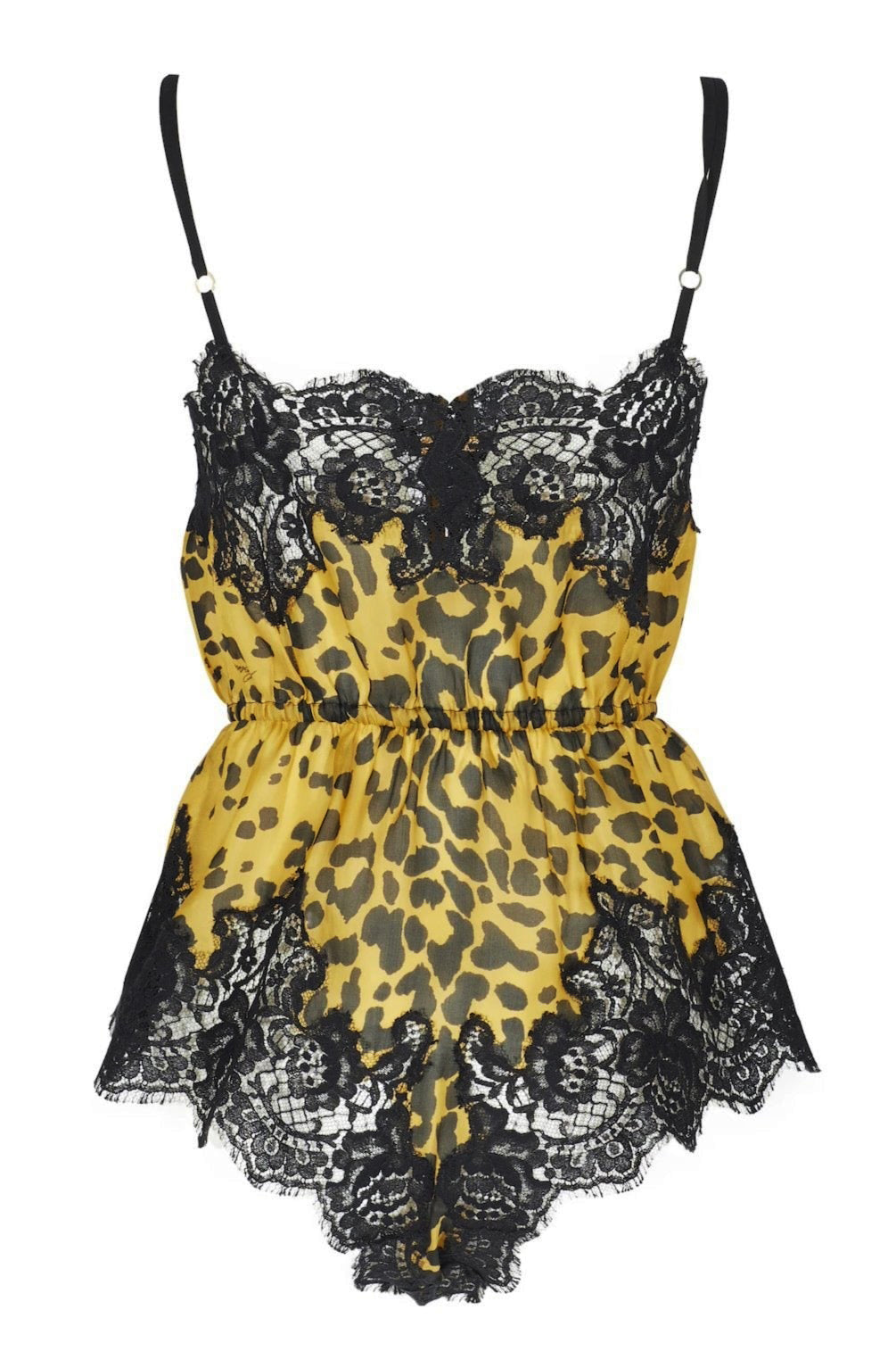 Rosamosario exclusive leopard body in printed silk with black chantilly lace. Pair it with its matching long robe.